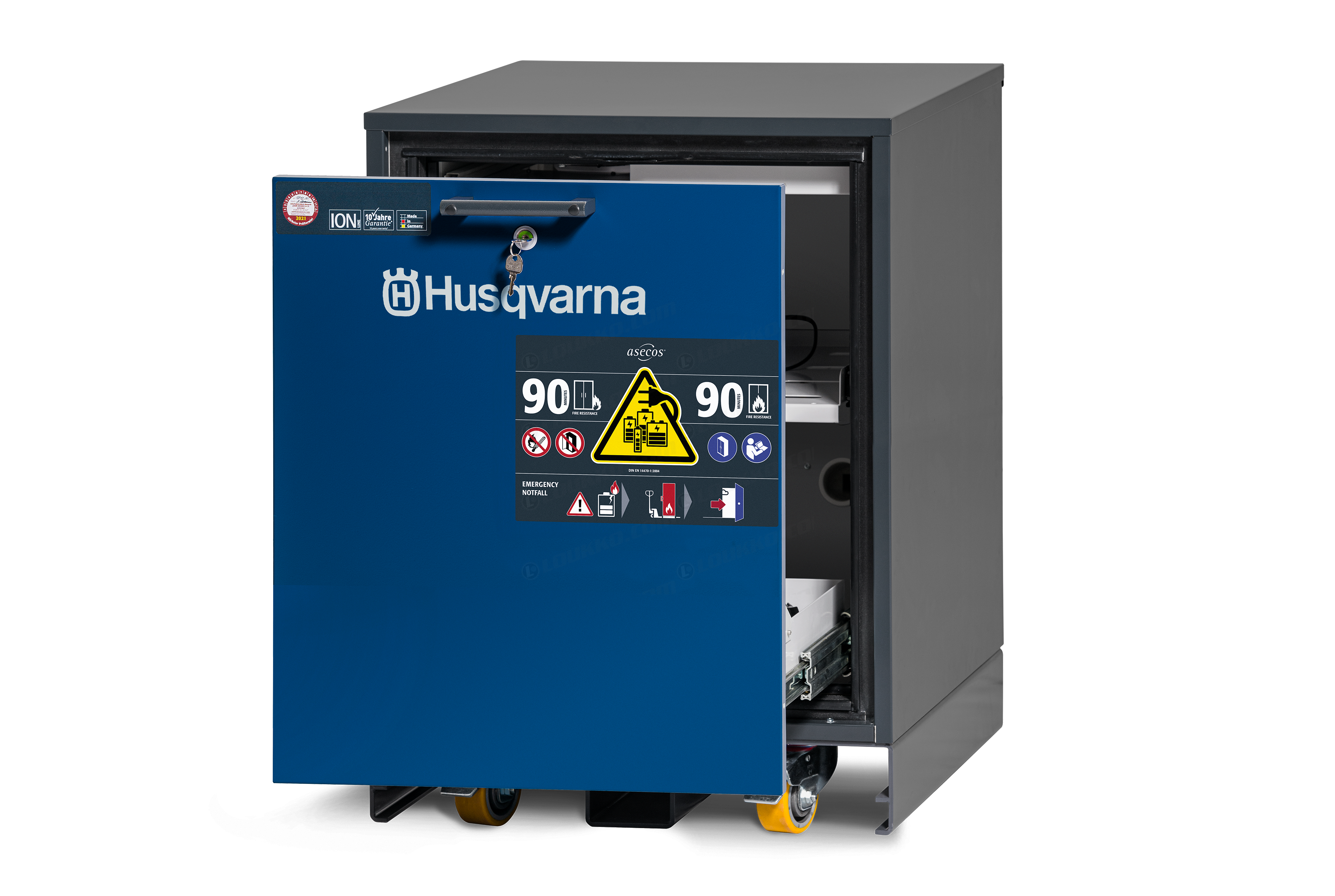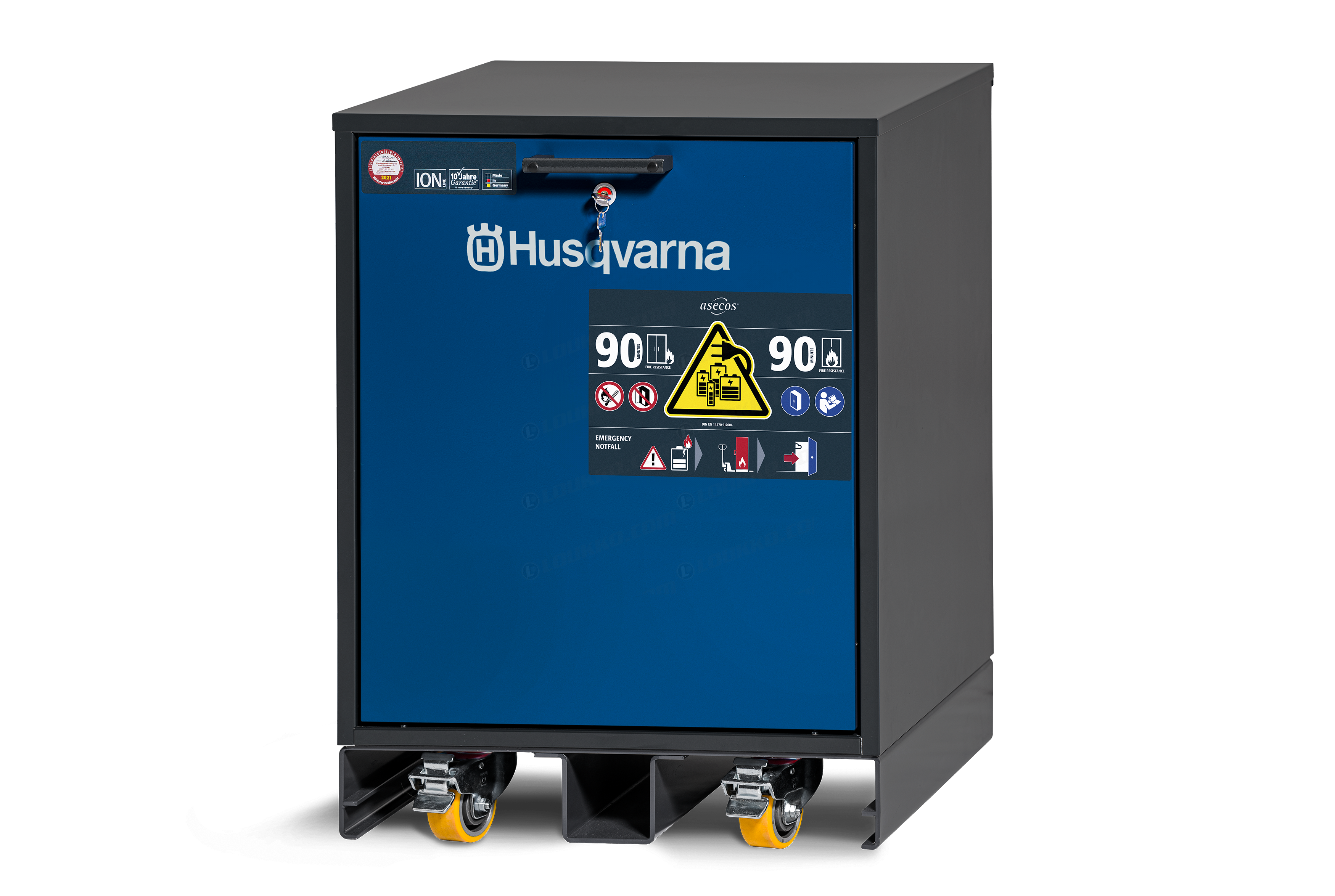 - Husqvarna-latauskaappi S on suunniteltu turvalliseen ja hyväksyttyyn litiumioniakkujen säilytykseen ja lataukseen