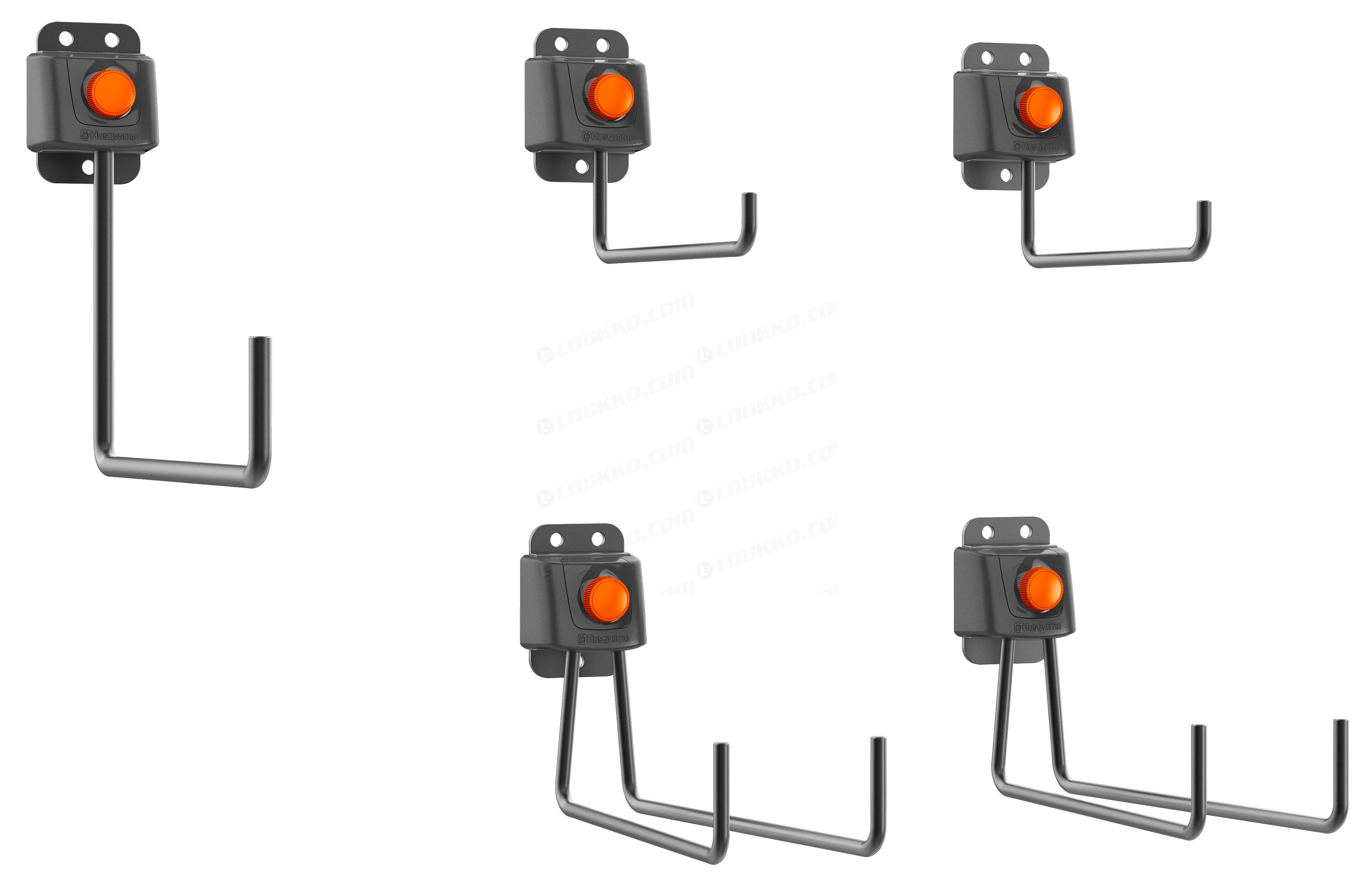 Tämä 5-koukkuinen Husqvarna-säilytyskoukkusarja on saatavana lisävarusteena. Sarja on optimoitu sopimaan yleisimpiin puutarhatyökaluihin vajassasi, kuten pientyökaluihin, vesiletkuihin tai harjoihin. Jokainen koukku voidaan kiinnittää seinään asennettavaan säilytyskiskoon tai suoraan seinälle.