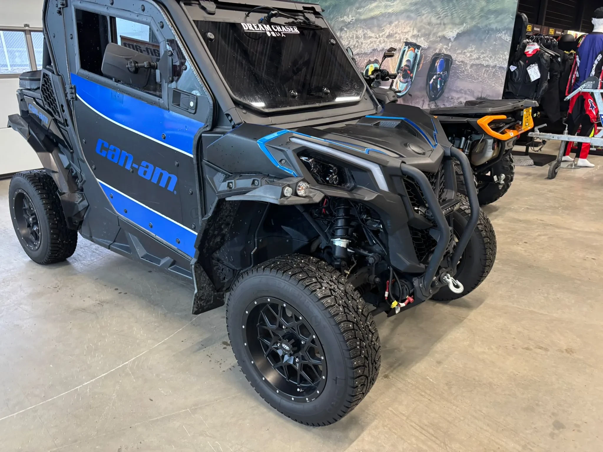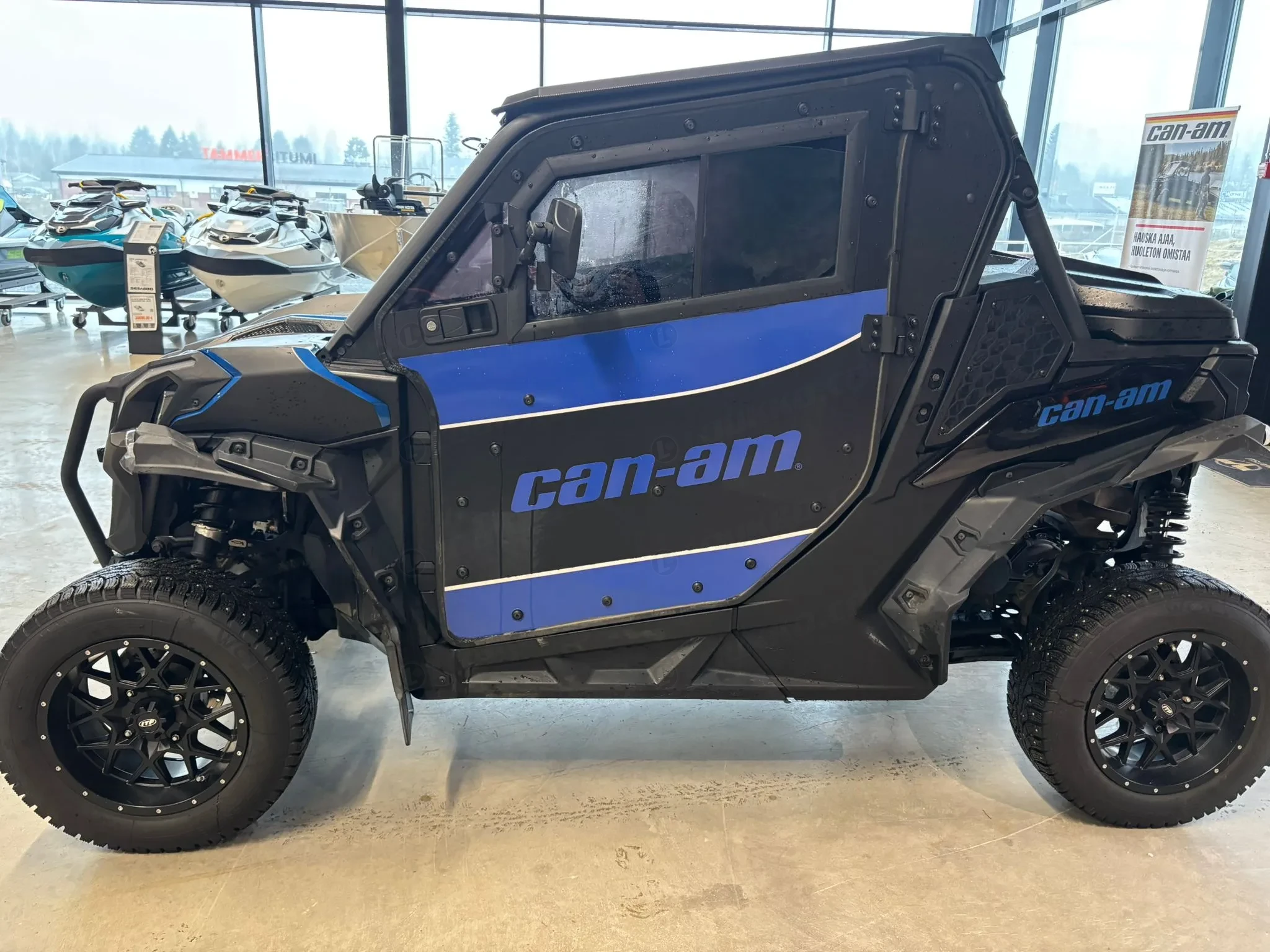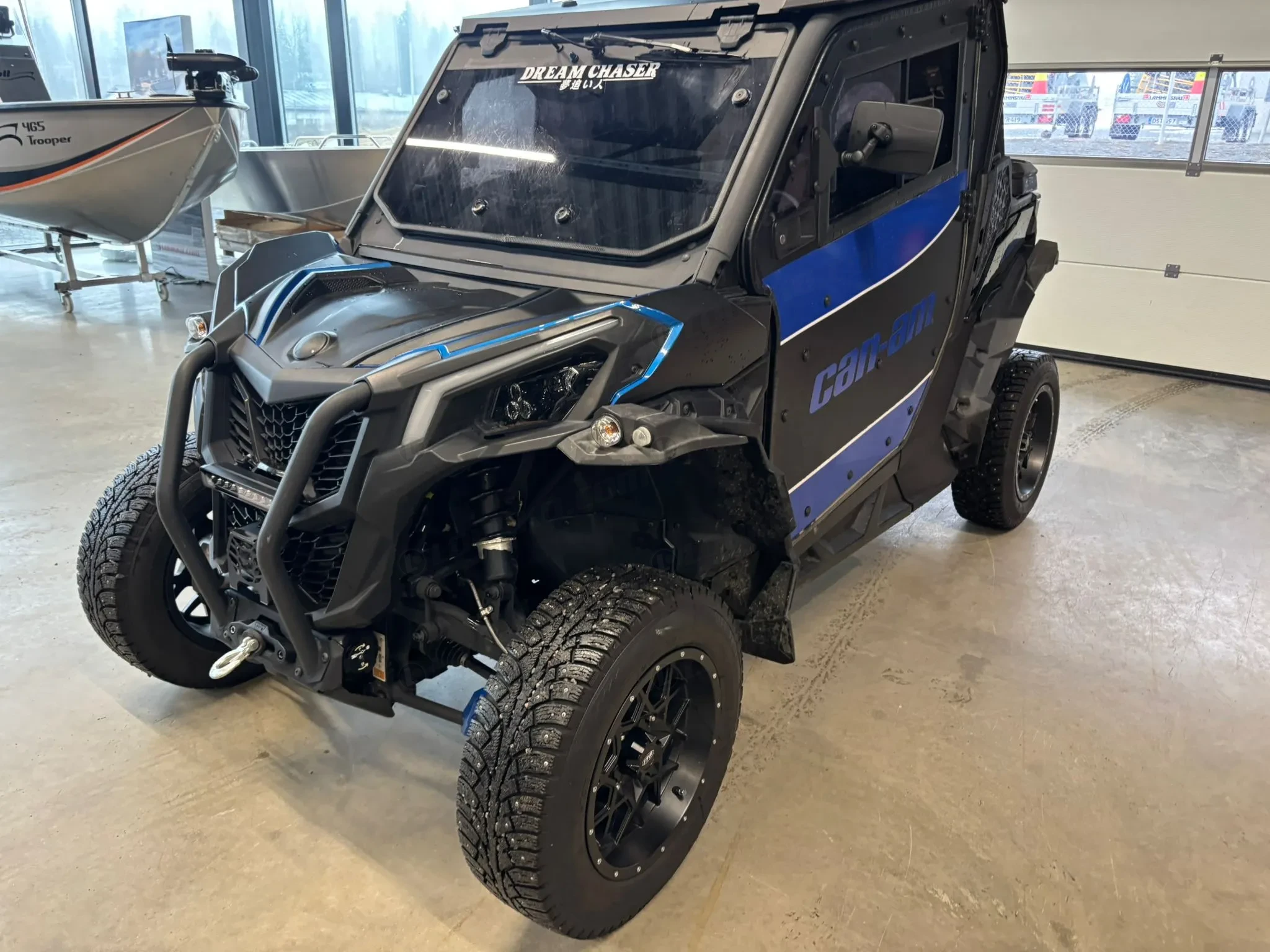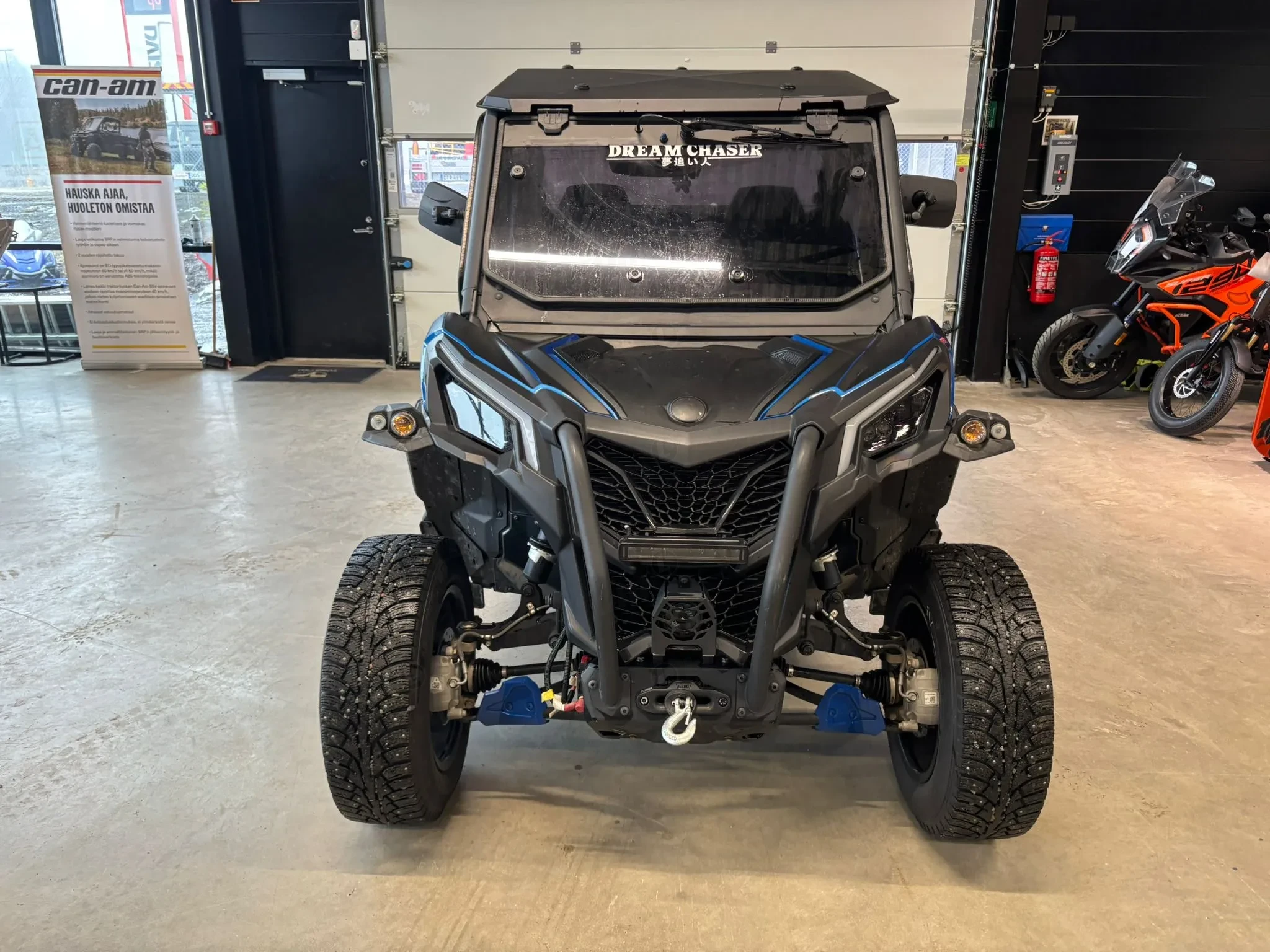 Tästä erittäin siisti ja näyttävä Can-Am Maverick Trail, joka on varusteltu kunnolla ympärivuotiseen käyttöön. Tämä yksilö on rakennettu toimivaksi niin metsätöihin, mökille, metsästykseen, lumiajoon kuin vapaa-ajan maastoajoon. Kapea Trail-malli kulkee helposti metsäpoluilla, mutta varustelun ansiosta ajaminen on mukavaa myös pidemmillä siirtymillä.