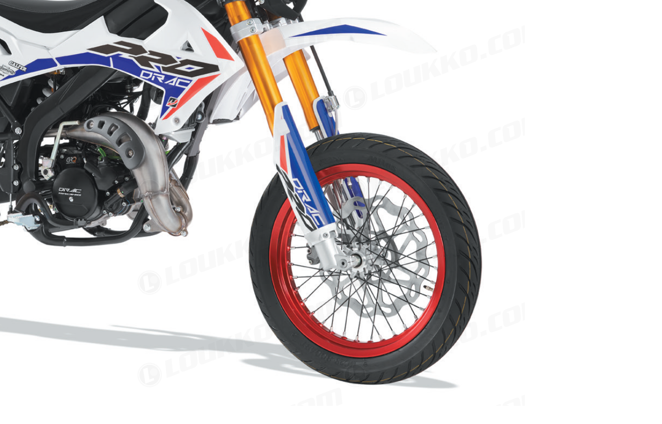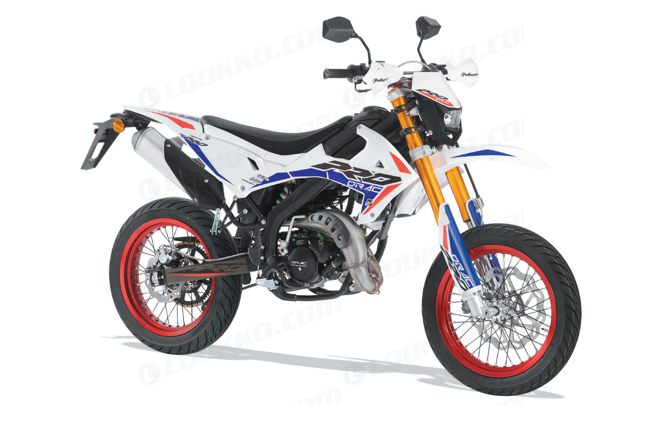 DRAC Supermoto 50 Pro Competition on PRO-sarjamme toinen upea kokonaisuus, joka on luotu kääntämään katseet. Tämän supermoton erikoisuutena on näyttävä Tricolor-teippaus, joka tuo sille ainutlaatuisen ja urheilullisen ilmeen. Jos haet huipputyyliä ja suorituskykyä, tämä mopo on valintasi!