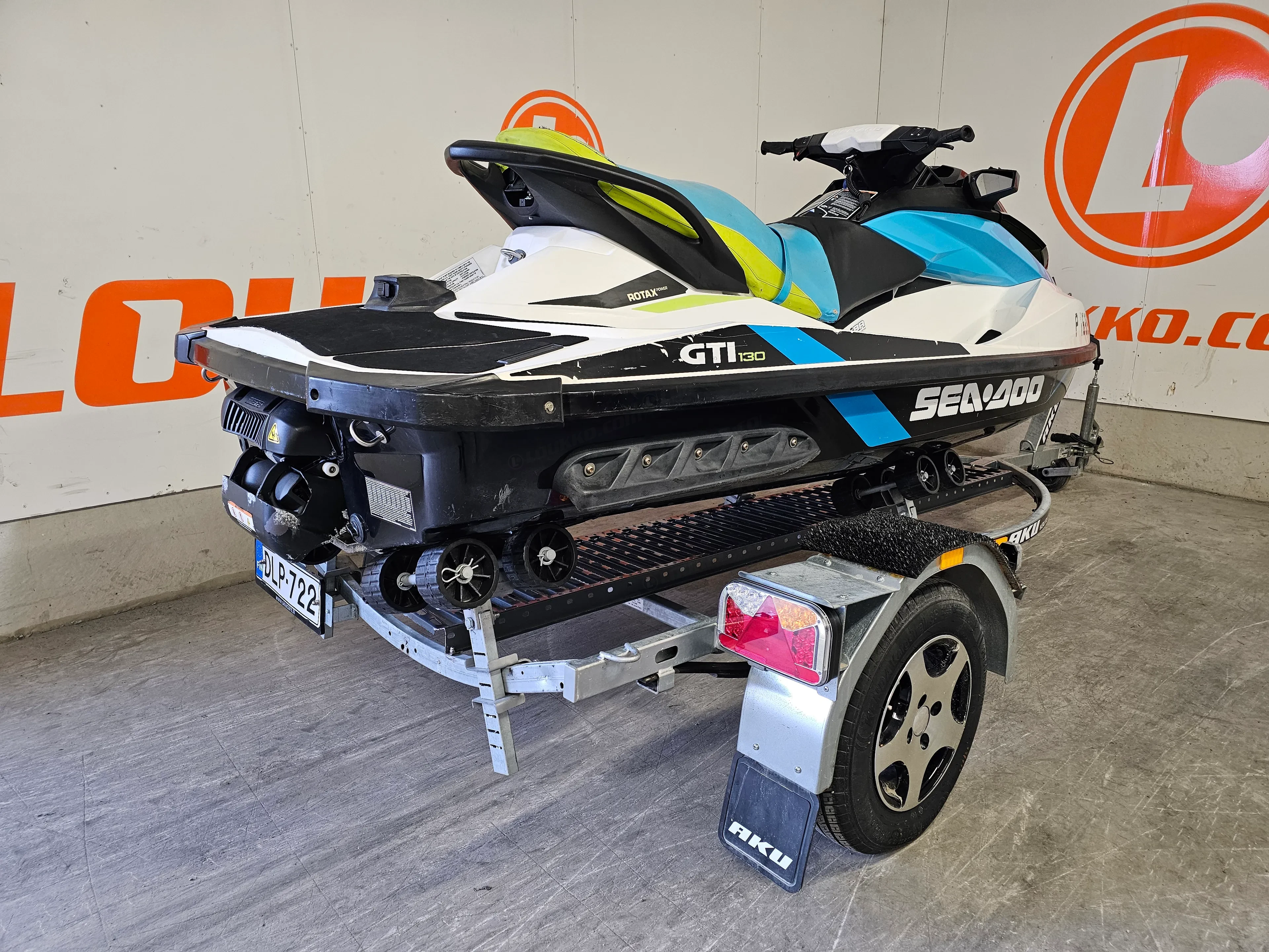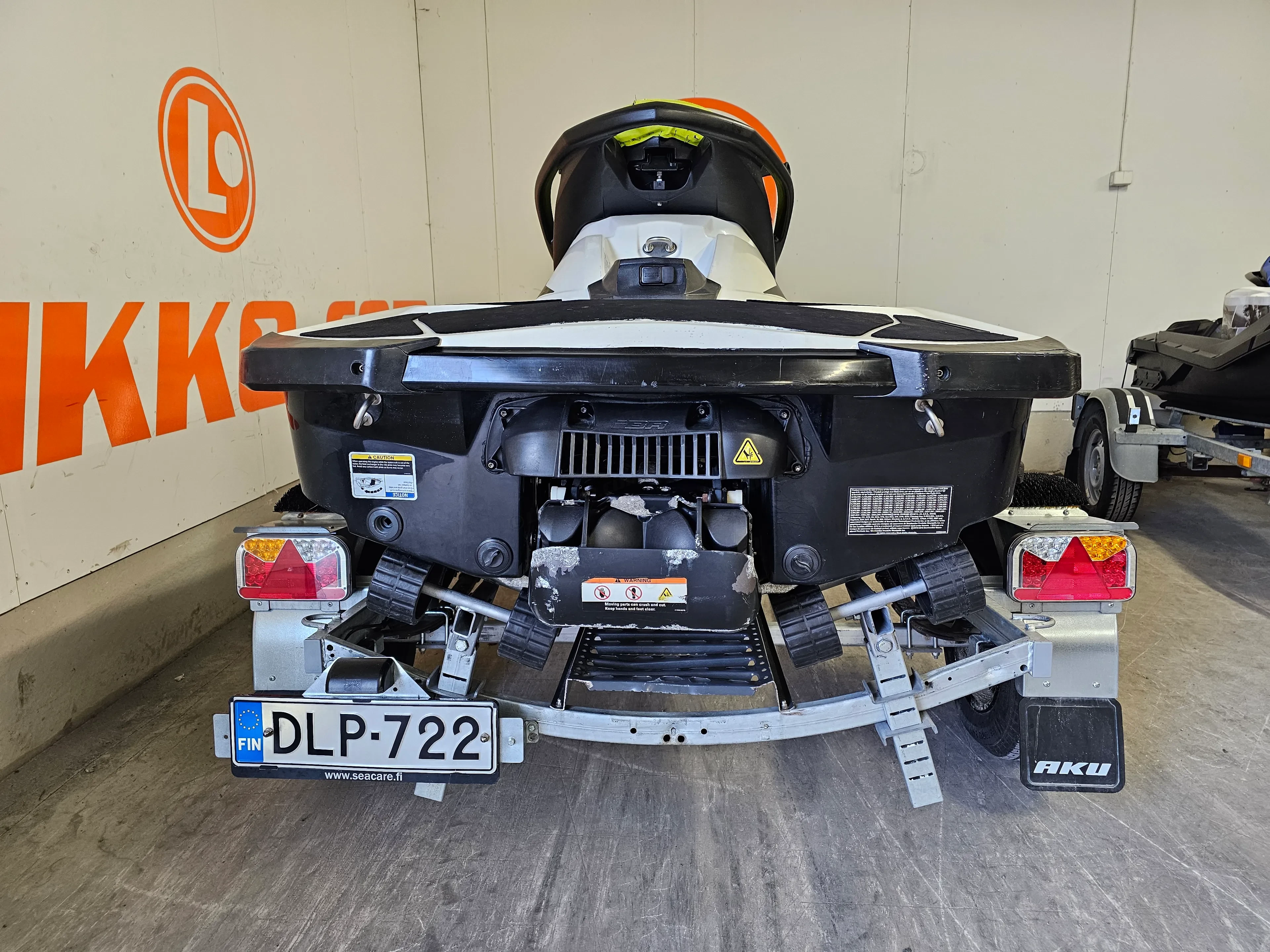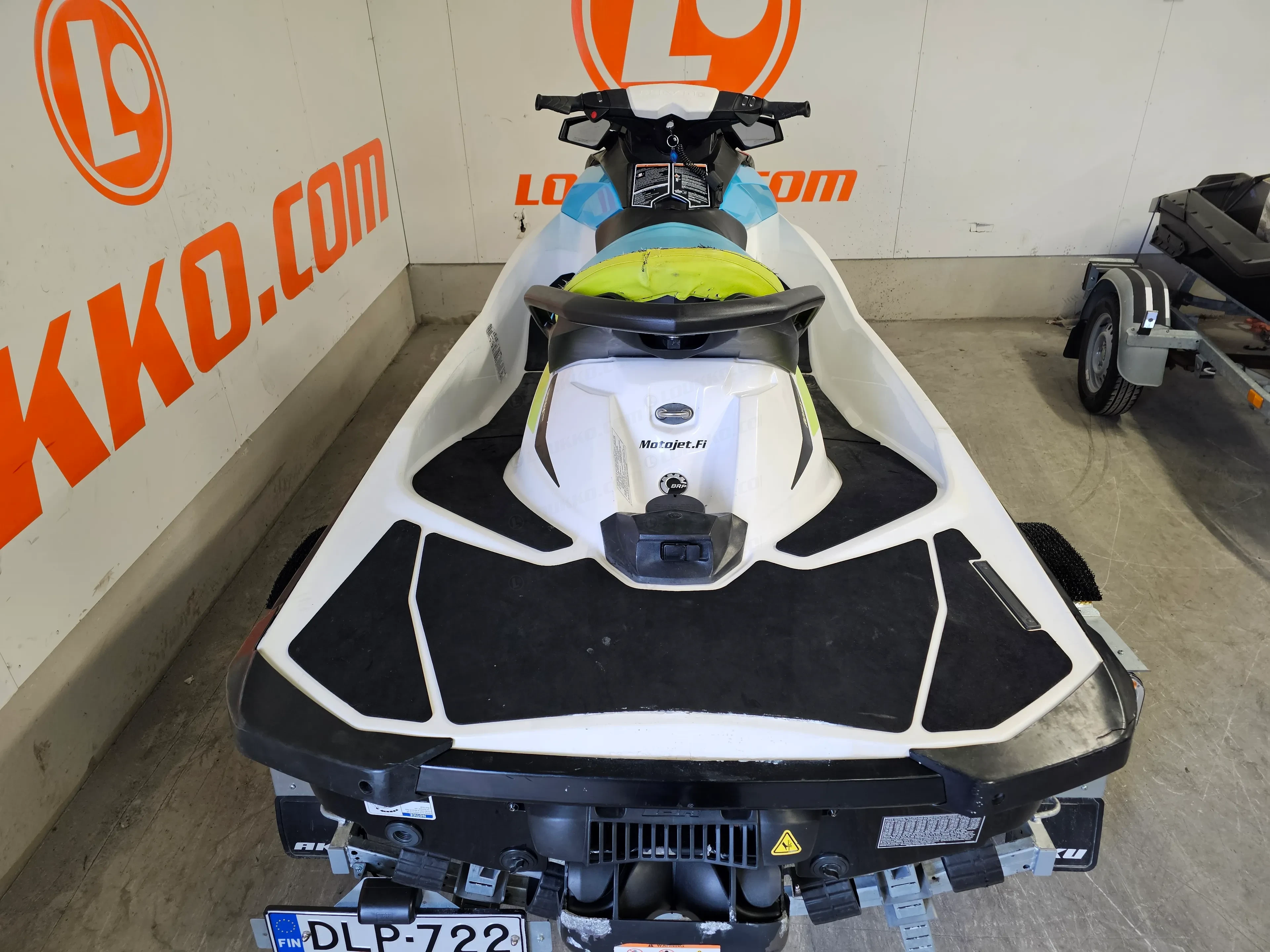 Tämä yksilö on ajettu 184 tuntia ja on ikäisekseen hyvässä kunnossa. Penkinnahassa on vaurio (katso kuvat), mutta se ei vaikuta ajamiseen. Mukaan tulee rekisteröity jetti traileri (DLP-722), joten paketti on oikeasti valmis – tankki täyteen ja vesille.